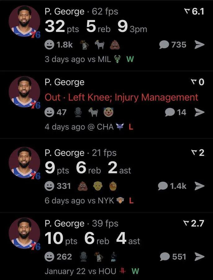 76人的情况变得有点尴尬,有乔治在的时候赢了16场输了11场,没有他的时候赢10场输10场,进攻效率掉了5点多,禁赛期间球队能省下1174万工资和587万奢侈税,从第5场比赛开始还能签个替补球员,要是真找到一个能打的,等乔治回来之后,他的位置可能就保不住了。